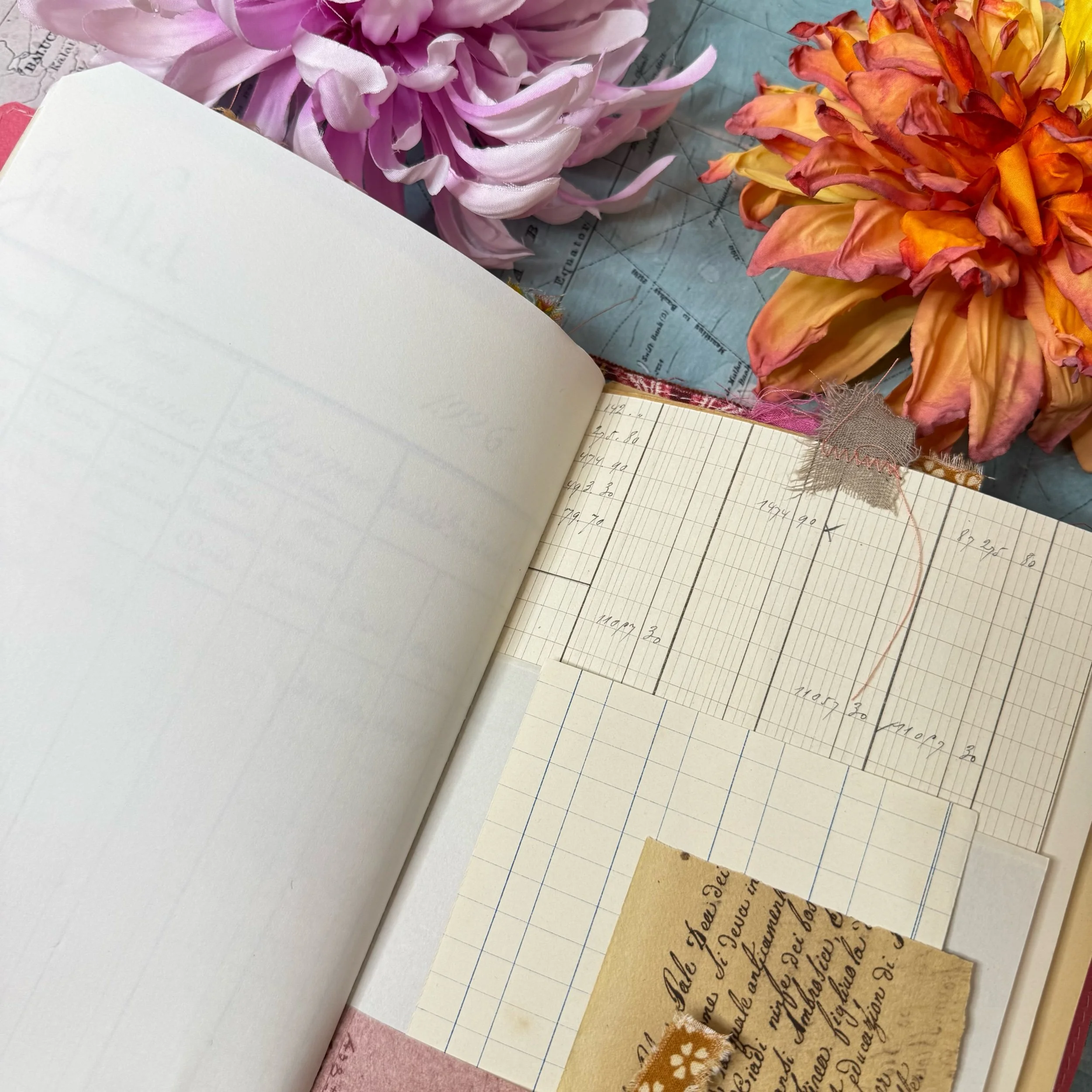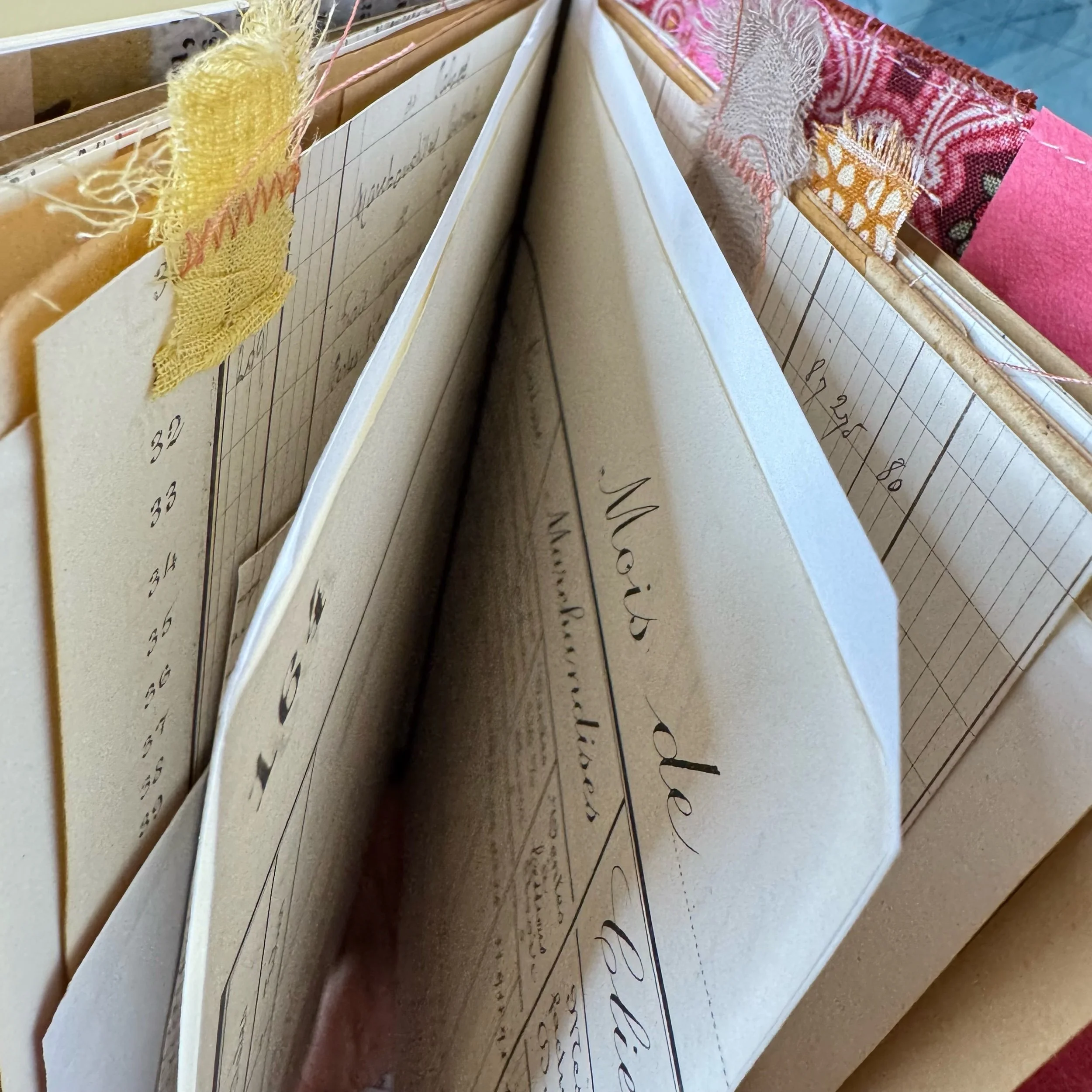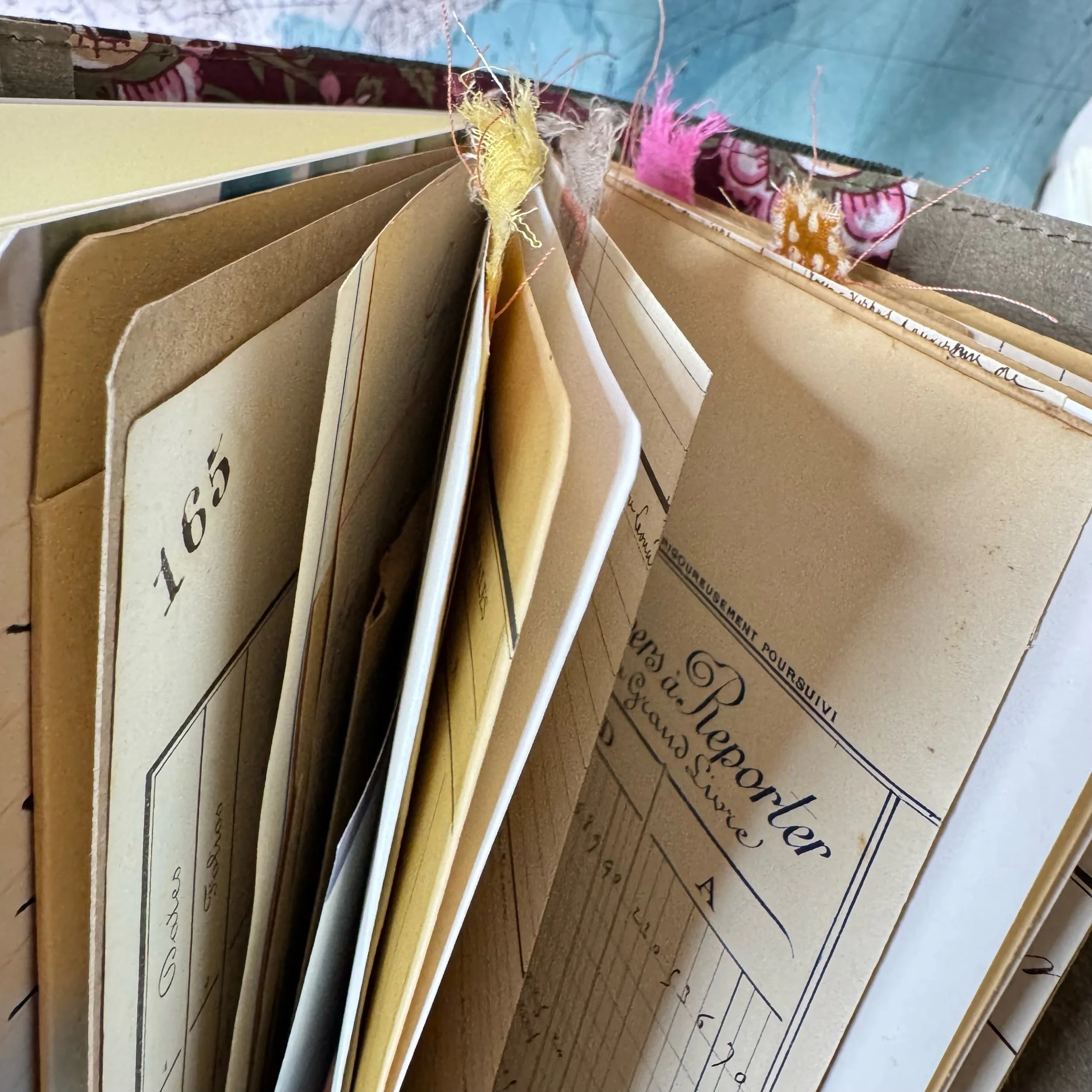 A5 insert of about 28 to 30 pages made of paper of various sizes and pockets